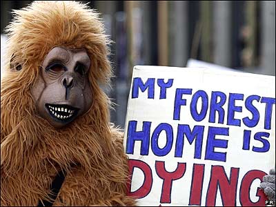 امروز در لندن راهپيمايی ای با حضور حدود 10000 نفر در اعتراض به سياستهای دولتها در ارتباط با گرم شدن کره زمين برگزار شد. در عکس فوق تظاهر کننده ای با ماسک ميمون، پلاکاردی در دست گرفته که روی آن نوشته شده: 'خانه من، جنگل در حال نابودی است.'