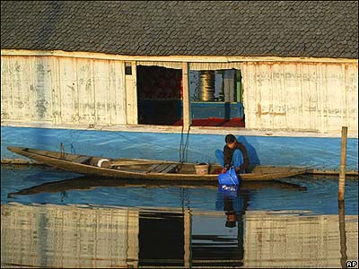 خانه ای شناور در حاشيه درياچه 'دال' در شهر سرينگار هند. خانه های شناور بر اين درياچه که تعدادشان به 1200 عدد می رسد، از مهمترين جذابيتهای توريستی اين منطقه به شمار می آيند.