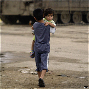 پسر عراقی در حالی که دختربچه کوچکی را در بقل گرفته از مقابل زره پوش يک واحد گشتی ارتش بريتانيا در بصره عبور می کند.