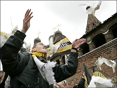 يکی از اعضای جنبش جوانان سلطنت طلب سنتی روسيه موسوم به 'Georgiyevtsky ' کبوتر های سفيدی را در روز وحدت ملی اين کشور آزاد می کند.