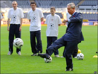 پرنس چارلز وليعهد بريتانيا در حال زدن يک ضربه پنالتی در جريان ديدار خود از باشگاه 'نيوکاسل يونايتد'.