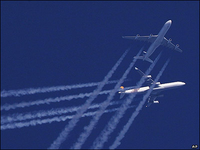 دو هواپيمای مسافربری متعلق به شرکت های لوفت هانزا و ايرفرانس در آسمان جنوب غربی لندن در فاصله نزديکی نسبت به يکديگر پرواز می کنند.