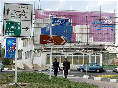 تابلوهای تبليغاتی تهران معمولا شب ها عوض می شوند. ماموران نيروی انتظامی مجوز شهرداری برای نصب تابلو را چک می کنند و کار تا صبح تمام می شود.