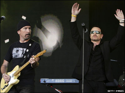 اعضای گروه U2 در جريان کنسرتی تحت عنوان "فقر را به تاریخ بسپاریم" در ملبورن استرالیا.
