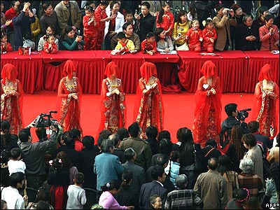 مراسم ازدواج گروهی زوجهای چینی در سیچوان چین. این مراسم در حاشیه جشنواره فرهنگهای مختلف عروسی برگزارشد. هدف این جشنواره شناساندن آداب و سنتهای مختلف عروسی موجود در آسیا است. |