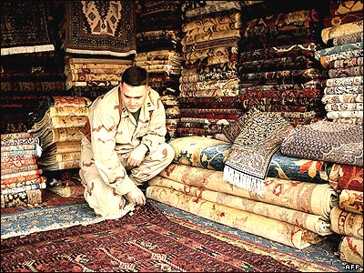 سرباز نیروی هوایی آمریکا در یک فرش فروشی در بازاری در کنار پایگاه هوایی بگرام در کابل. حامد کرزی طی سخنانی در يک کنفرانس بين المللی در هند هشدار داد که بی ثباتی در کشورش، ثبات و امنيت منطقه را نيز جدا تهديد می کند.
