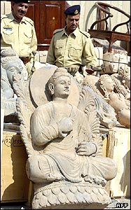 ماموران گمرک پاکستان در حال بررسی مجموعه ای از اشیا عتیقه کشف شده. این اشیا در هنگام بازرسی محموله یک کشتی در بندر کراچی که عازم شارجه در امارت متحده عربی بود، کشف و ضبط شدند.