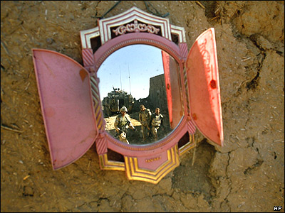 تصوير سربازان کانادايی ناتو در آينه ای بر روی يک ديوار در ناحيه پنجوايی در قندهار افغانستان. مقامات ناتو می گويند برای نخستين بار در ماههای اخير، حملات شورشيان مخالف دولت افغانستان، 'چندين برابر کاهش يافته است' |