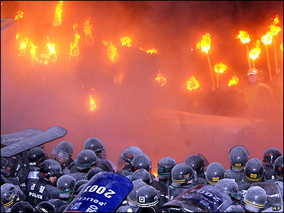 تظاهرات ضد دولتی کشاورزان در شرق سئول، پايتخت کره جنوبی. در عکس پليس ضد شورش سعی دارد مانع هجوم تظاهر کنندگان مشعل به دست به يک ساختمان دولتی شود.