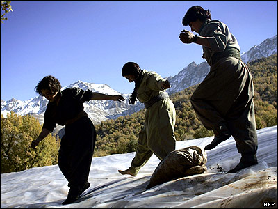 جنگجويان حزب کارگران کردستان ترکيه - پ کا کا در اردوگاهی در منطقه خودمختار کردستان عراق، نزديک به مرز ايران، سقف کلبه سنگی شان را با لايه ای از مشما می پوشانند.