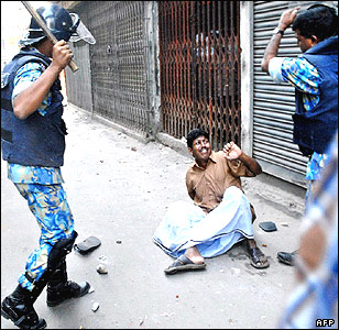 پليس ضد شورش بنگلادش در حال تلاش برای متلاشی کردن تظاهرات سه روزه ای که وسايط نقليه عمومی را در اين کشور فلج کرده است.