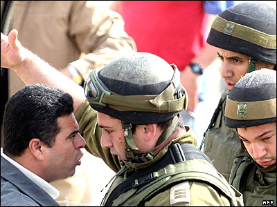 یک معترض فلسطینی در حال مشاجره لفظی با یک سرباز اسراییلی درباره ازسرگیری مجدد سیاست حصارکشی به دور مناطق فلسطینی نشین در کرانه باختری توسط اسرائيل.