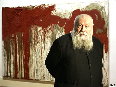 "هرمن نیتش"، نقاش معروف اتريشی، در مقابل یکی از آثار خود که با رنگ روغن و خون کشیده شده، در موزه ای در برلین. |