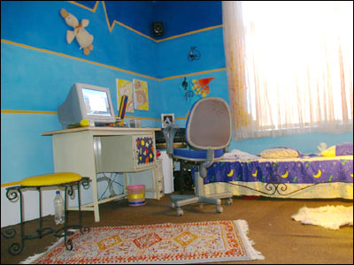 عاشق اتاقم هستم. خودم رنگش کردم. آبی چون رنگ آرامشه. با خط های زرد که نشانه نور خورشید هستن که به اتاقم نفوذ داره. درتمام اتاقم اثری از خورشید هست. با چیزهای ساده مثل نقاشی هام، برگ ها، شیشه های خالی، عروسک ها، گل های کوهی و یا حتی تکه چوبها اتاقم رو تزئین می کنم. اینجا دنیای منه که کس دیگری حاکم بر اون نیست.