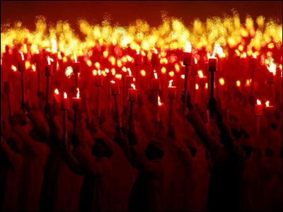 هنرمندان با مشعل هايی که در دست دارند به عربی و انگليسی نوشته اند: سلام و عليکم
