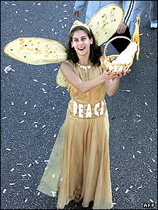 يک دختر لبنانی در لباس فرشته ها در پيشاپيش مسابقات دو ماراتون در بيروت. مسابقه امسال باوجود تظاهرات حزب الله لبنان و گروه های طرفدار سوریه در بیروت برگزارشد