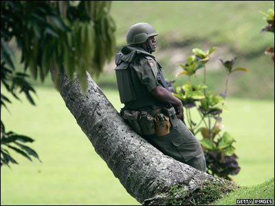 يک سرباز ارتش فيجی در حال نگهبانی از مقر اصلی پليس در اين کشور. اختلافات داخلی در فيجی، ترس از اقدام به کودتا در بين نيروهای طرفدار دولت را به وجود آورده است.