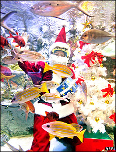 يک زن غواص با لباس بابا نوئل در اکواريومی در ژاپن.