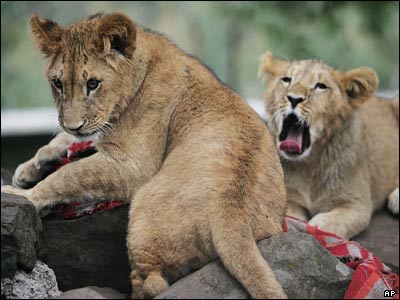 دو بچه شیر در باغ سفارت ایتالیا در اتیوپی. این دو بچه شیر پس از کشته شدن مادرشان در یک منطقه روستایی به باغ این سفارت آورده شده اند