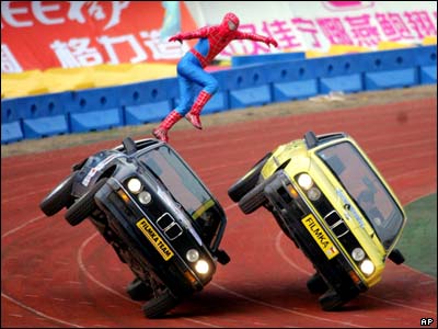 یک بدلکار چینی در حال پرش به روی اتومبيلی در حال حرکت در شهر "وا هان" در کشور چین