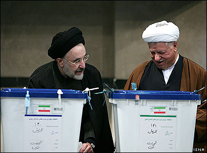 اکبر هاشمی رفسنجانی و محمد خاتمی، روسای جمهور پيشين ايران برای رای دادن در حوزه انتخاباتی تجريش، در شمال شهر تهران حاضر شدند. (عکس از امير خلوصی)