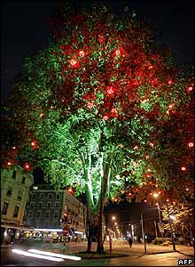 درختی واقعی در ژنو که توسط ژرو پريول، هنرمند فرانسوی تزئين شده است. |