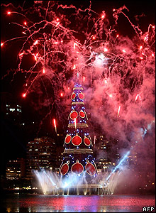 برزيلی ها هم در ريودوژانيرو درختی مصنوعی را با چراغهای پر نور در کنار تالاب شهر بر پا کرده اند.