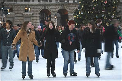 ساختمان مجلل و باشکوه 'سامرست هاوس' که در قرن هجدهم در لندن بنا شده، امسال برای ايام کريسمس و سال نو ميلادی، يک پيست اسکيت روی يخ (پاتيناژ) تدارک ديده است. اين پيست در محدوده ميانی حياط اين ساختمان نصب شده و می توان به راحتی فضای زمستانی و سرد اين ايام را حس کرد.