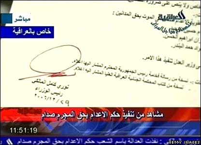 برای متقاعد کردن مردم جهان از اجرا شدن حکم اعدام و کشته شدن صدانم تلويزيون عراق صحنه هايی از امضاء حکم اعدام و لحظه های آخر زندگی صدام را به نمايش گذاشت