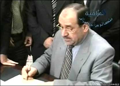 حکم اعدام صدام حسين از طريق به دار آويختن توسط نخست وزير عراق نوری مالکی به امضاء رسيد