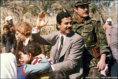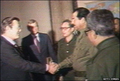 در طول جنگ بين دو کشور، صدام حسين از حمايت آمريکا به رياست جمهوری رونالد ريگان برخوردار بود. صحنه ای از خوشامدگويی صدام به دونالد رامسفلد، فرستاده دولت آمريکا به عراق. رامسفلد در زمان حمله دوم آمريکا به عراق در سال 2003 وزارت دفاع آمريکا بر عهده داشت.