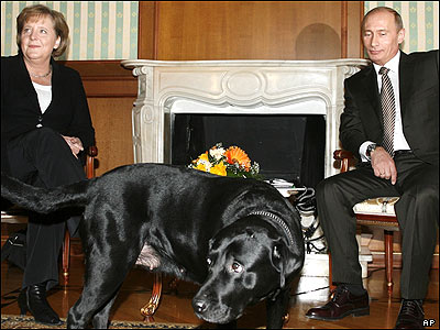 آنگلا مرکل صدر اعظم آلمان و ولاديمير پوتين رييس جمهور روسيه برای انجام گفتگوهايی در تفرجگاه سوچی در سواحل دريای سياه ديدار کردند. سگ آقای پوتين در عکسی که از اين ديدار گرفته شده ديده می شود.