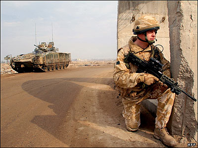 سرباز بريتانيايی که واحد گشتی اش در شهر بصره در جنوب عراق هدف يک بمبگذاری در کنار جاده قرار گرفته، به حالت آماده باش در می آيد.