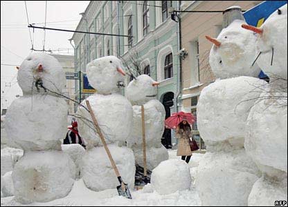 آدم برفی های عظيمی که برای استفاده در يک نمايش تئاتر در يکی از خيابانها مسکو، پايتخت روسيه ساخته شده اند.