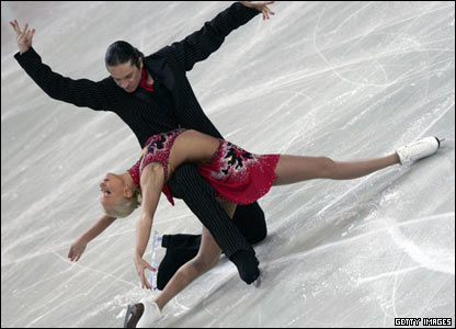 اجرای رقص روی يخ توسط زوج اسکيت باز روس در مسابقات قهرمانی اروپا در ورشو. |