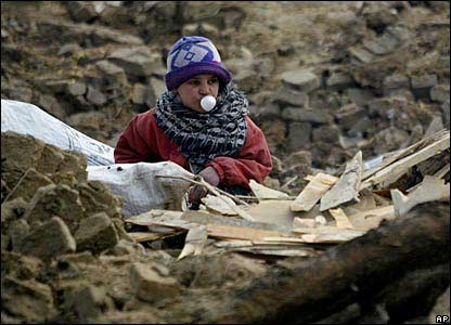دختر بچه افغان در ميان چوبهايی که از بقايای يک ساختمان تخريب شده جمع آوری کرده است.