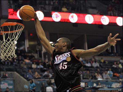 در مسابقات ليگ بسکتبال حرفه ای آمريکا، ان بی ای، فيلادلفيا سونتی سيکسرز، نيواورلئان را 89 به 78 شکست داد. اين مسابقه در سالن هارنتس در اوکلاهوما برگزار شد. استيون هانتر از تيم فيلادلفيا، به سمت سبد حمله می کند.