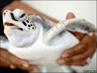 يک نوع لاک پشت آبی که دانشمندان معتقدند نسلش رو به نابودی است در مالزی به نمايش گذاشته شده است.