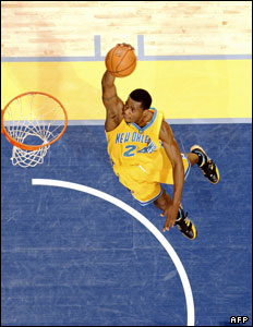 در مسابقات ليگ بسکتبال حرفه ای آمريکا، ان بی ای، ممفیس گریزلیز، نیواورلئان را 108 بر 104 شکست داد. اين مسابقه در تنسی برگزار شد. دزموند میسون از نیواورلئان به سمت سبد حمله می کند.