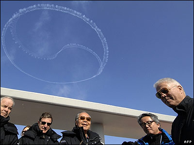 در حالی که معاون رئیس کمیته ملی المپیک کره جنوبی و دیگر مقامات رسمی از دهکده المپیک گانجنونگ بازدید می کنند، چند هواپیما نشان ملی کره جنوبی را در آسمان رسم کردند.