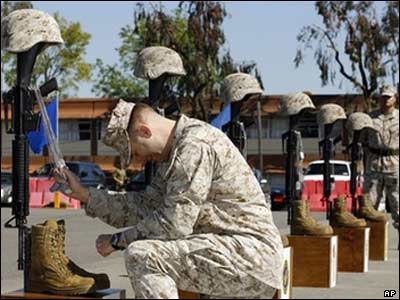 یک تفنگدار دریایی آمریکا در قرارگاه پندلتون، نزدیک سن دیه گو، به تجهیزات نظامی همقطاران کشته شده اش ادای احترام می کند.
