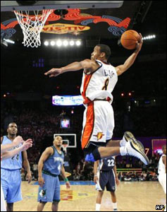 سوفومور مونتا الیس، بازیکن تیم گولدن استیت واریورز در مسابقات بسکتبال ستارگان برتر آمریکا که در لاس وگاس برگزار می شود به سمت سبد حمله می کند.