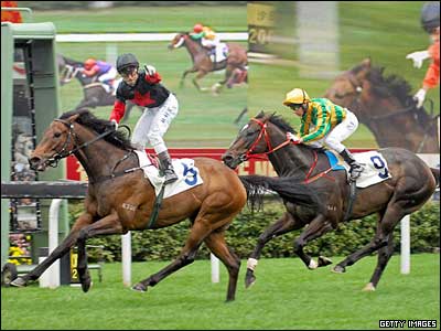 اولیویر دالوز از فرانسه (چپ) برنده مسابقه اسب سواری جام دو میلیون دلاری "سال نو چینی" شد. این مسابقه در پیست شاتین، هنگ کنگ، برگزار شد.