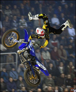 حرکت نمایشی از رمی بیزوار موتورسوار فرانسوی: رقابتهای قهرمانی جهانی پرش آزاد با موتور، در سالن تیپ اسپورت جمهوری چک برگزار شد.