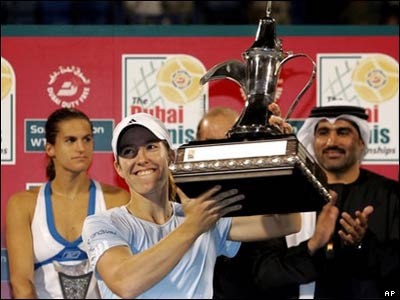 در فينال تورنمنت تنيس يک و نيم ميليون دلاری دوبی، موسوم به Dubai Duty Free، جاستين هنين تنيس باز بلژيکی، با پيروزی دو بر صفر، بر حريف خود اميلی مورسمو تنيس باز فرانسوی، غلبه کرد و نفر اول اين مسابقات شد