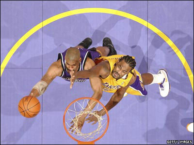 در ادامه مسابقات ليگ بسکتبال حرفه ای آمريکا، ان بی ای (NBA)، در دیدار لس آنجلس لیکرز و ساکرامنتو کینگز، بازیکنان دو تیم برای تصاحب توپ تلاش می کنند. مسابقه با نتیجه 116 بر 108 به سود کینگز به پایان رسید