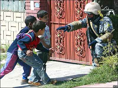در جریان جستجوی خانه به خانه در مناطق مختلف بغداد، یکی از اعضای پلیس عراق با کودکان بازی می کند.