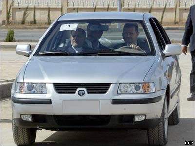 بشار اسد، رئیس جمهور سوریه (راست) همراه پرویز داودی معاون اول رئیس جمهور ایران (چپ)، خودرو شام (Shaam) محصول مشترک دو کشور را آزمایش می کند.