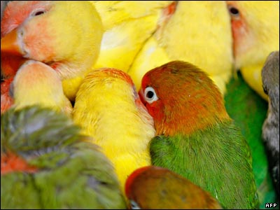 طوطی های رنگارنگ در بازار پرندگان هنگ کنگ برای فروش عرضه شده اند.