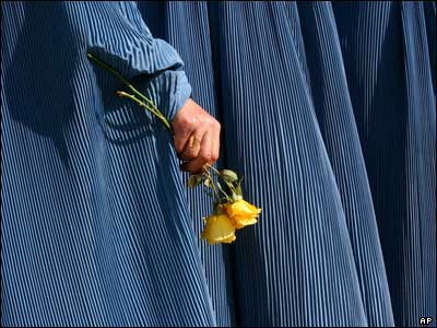 یک زن افغان دو شاخه گلی را که به مناسبت روز جهانی زن از گروه وابسته به سازمان ملل گرفته در دست دارد